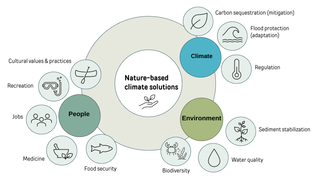 We define nature-based climate solutions as actions that protect, restore, or improve the management of coastal ecosystems to address climate change and its impacts, while also supporting biodiversity, community well-being, and cultural values.